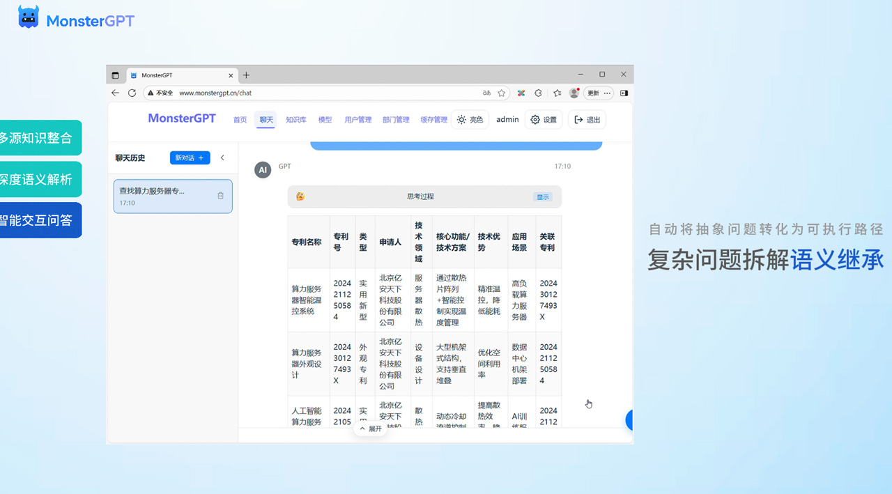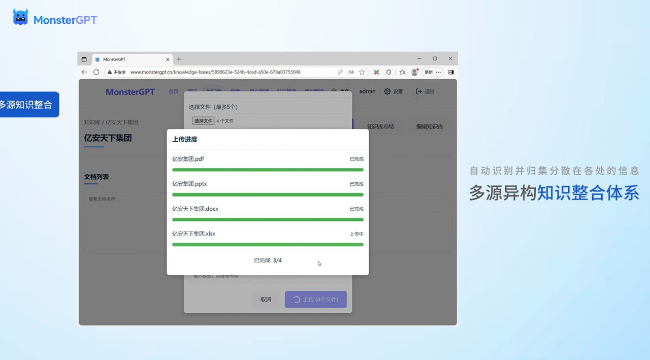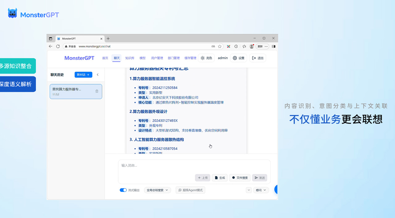 在数字化转型加速推进的今天,如何让分散的知识高效流动、转化为业务创新的动力,成为企业突破增长瓶颈的关键。MonsterGPT智能知识管理平台,以“AI原生的一站式知识管理平台”,重新定义知识管理的效率标准。平台核心聚焦“知识流动驱动业务创新”,通过构建“自动采集-深度解析-智能交互-安全保障”的全链路知识管理能力,打破传统知识管理系统的效率瓶颈。