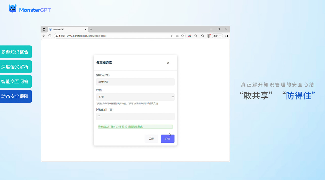 在知识管理领域,“共享”与“安全”似乎总是一对难以调和的矛盾——既要让团队高效获取所需信息,又要严防核心数据外泄。MonsterGPT 智能知识管理平台的动态安全保障体系,正是为破解这一困局而来,通过技术创新构建起全方位的知识防护网。该体系的核心在于多维动态权限矩阵,它像一位“智能门卫”,会调整访问权限:首先是用户角色,比如销售团队能接触客户资料,而研发团队则可查看技术文档;其次是业务场景,内部沟通时可共享详细方案,对外投标时则自动过滤敏感数据。这种“千人千面”的权限管理,确保每个用户只能接触到“该看”的内容。